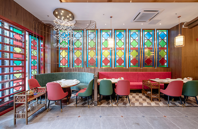 品深餐飲全案設計的悅得閑廣式點心茶樓,家具的軟包顏色使用紅配綠,奢華典雅有活力;大紅配大綠,富貴吉祥更添財氣。家具靠背的圖案則是與品牌文化高度相融的嶺南園林傳統圖形。