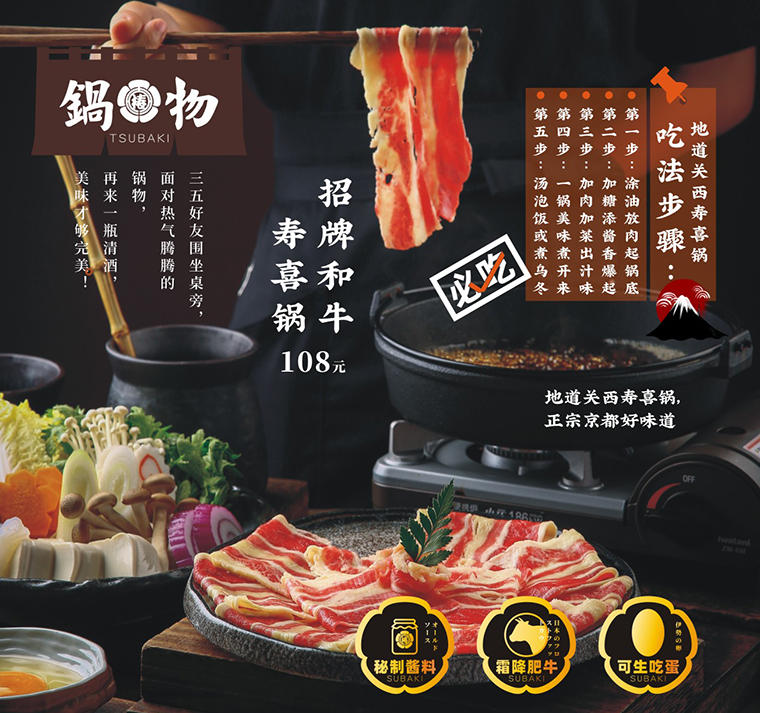 壽喜鍋也可以深入挖掘,做成日本火鍋料理100平米的小店。通過品類的細分,打造專注專業的品牌形象,還可以進一步優選食材,放大競爭優勢,并利用宣傳推廣渠道,取得區域市場的領先優勢。