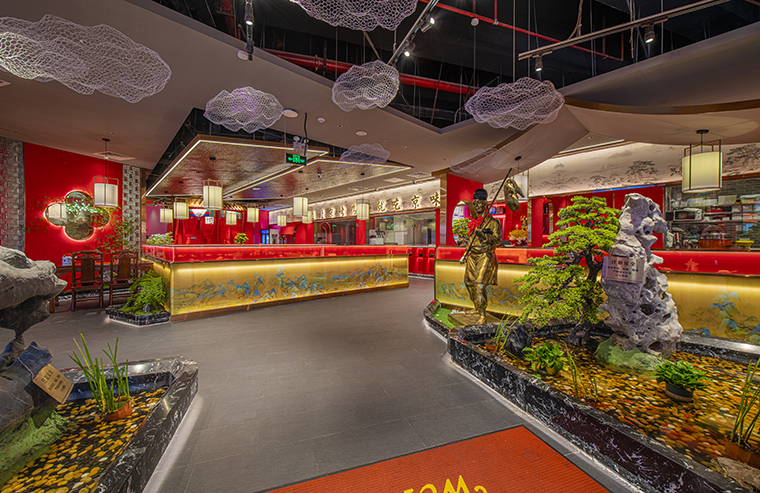 京味張的空間裝飾設(shè)計(jì)大量借鑒了中式園林造景手法,一步一小景、三步一大景,步移景異。用中國(guó)紅強(qiáng)化品牌內(nèi)含的北京皇城文化,令人印象鮮明;門(mén)口的迎賓人,提籠遛鳥(niǎo)人,跑堂人等雕塑銅人將老北京烤鴨飲食文化自然帶出;中式園林造景手法,點(diǎn)綴綠植,水景,框景,步移景異;天花的不銹鋼波紋板,一朵朵的祥云裝飾;矮隔斷的千里江山中國(guó)山水工筆畫(huà)造型裝飾,仿佛流動(dòng)的山水國(guó)畫(huà);立面的水晶玻璃磚,暗藏?zé)魩У牟AЦ魯?,空間中各種不銹鋼收邊條,明檔上的不銹鋼背發(fā)光字,現(xiàn)代裝飾材料與經(jīng)典美食交相輝映,經(jīng)典不失時(shí)尚。