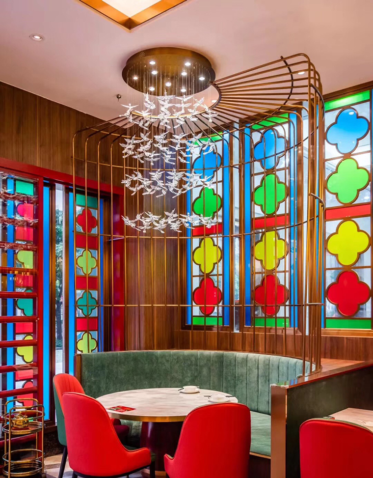 中,我們將廣式花窗大面積使用在正面形象,進門口,包房隔斷等,形成了強烈的視覺沖擊力,具有鮮明的品牌感。