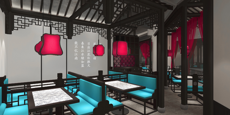如:品深餐飲設計過的二小姐的店,從蘇杭古典園林中獲取靈感元素,將江南園林中“連廊”的建筑形式引入項目空間中,并與不同的座椅形式完美組合,營造出室外廊下的用餐體驗場景化的設計。將江南的粉墻黛瓦,飛檐翹角,通過剪影化的設計手法,成為空間立面的裝飾造型元素。長形的沙發(fā)座椅靠背設計借鑒江南建筑的欄桿造型(又稱美人靠),與背景的建筑剪影形成形式的完美統(tǒng)一。并將江南的水色山光,山嵐煙云,通過淡墨山水的形式移植進餐廳的墻面,作為整個餐廳的背景,
