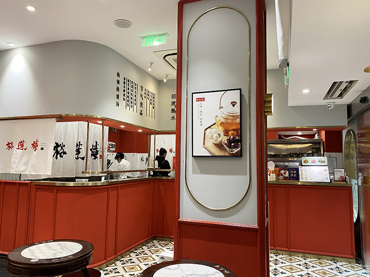 我們通過對香港本土糖水店,上海當地糖水老鋪進行詳細的調研,并結合當下流行趨勢。我們發現,喝糖水最多的都是女性顧客,糖水有養顏駐顏的功效。我們提取了當下最流行的“故宮紅”,將主題定位為“來自故宮的視覺盛宴”,整個門店大面積紅色和金色搭配,配色熱情而有貴氣。