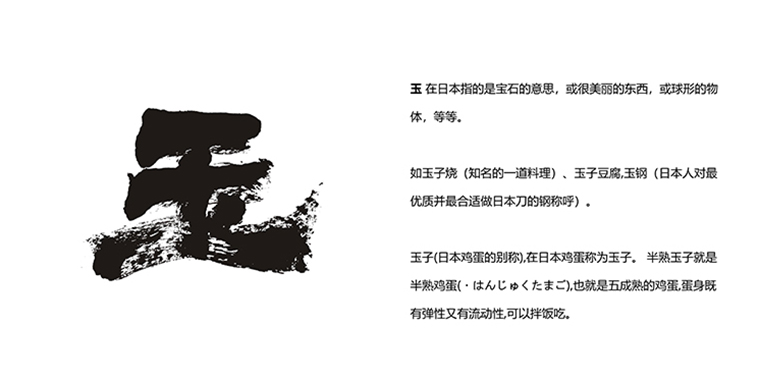 玉”在日本指的是寶石的意思,或很美麗的東西,或球形的物體等等。如玉子(日本雞蛋的別稱),半熟玉子就是半熟雞蛋(はんじゅくたまご),也就是五成熟的雞蛋,蛋身既有彈性又有流動(dòng)性,可以拌飯吃。玉子燒(知名的一道料理),玉子豆腐,玉鋼(日本人對最優(yōu)質(zhì)并最合適做日本刀的鋼的美稱)。