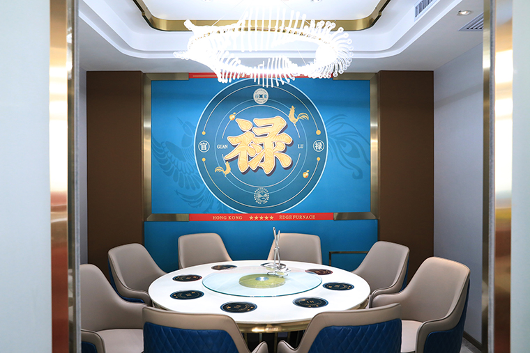 整體氛圍去掉繁雜多余的線條,多用皮質(zhì),不銹鋼材質(zhì),呈現(xiàn)精致,高品質(zhì)的用餐氛圍!空間的整體照明燈光以柔和面光為主,餐桌上方局部聚光燈照明,突出火鍋湯底的特色,金黃明亮;特色的吊燈,讓空間層次鮮明,港風(fēng)濃郁。家具以皮革為主,金屬收邊,加上小屏風(fēng)讓空間感更通透,能表達(dá)出輕奢的質(zhì)感。