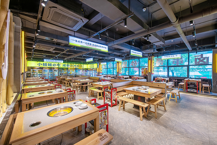 3、為了表現(xiàn)成都串串香火鍋店的市井氣息,我們?nèi)サ袅说蹴敚瑴p少立面造型,墻體使用了水泥面,還原出老成都串串香火鍋店的場景氣質(zhì),家具使用木質(zhì)卡座與條凳八仙桌,竹椅,此次門店還創(chuàng)造性地沒有使用吊燈,僅使用軌道射燈,整個空間硬裝修造價不到800元每平方米,是后疫情時期餐飲門店裝修投資最好方向。