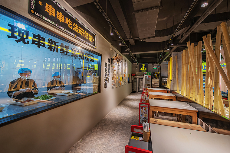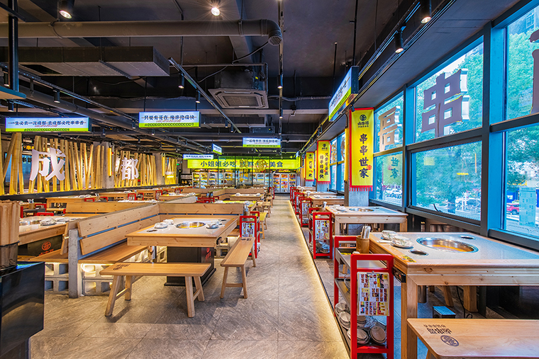 在空間中,我們用鹵串哥品牌強(qiáng)關(guān)聯(lián)的具體一個竹元素串聯(lián)整個裝飾,形成品牌專屬識別記憶,并與串串香的竹簽子,竹椅相呼應(yīng),既有品類特征,又是品牌文化的經(jīng)典傳達(dá)。