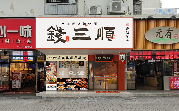1、從門頭設計到門面設計表達,整個門店設計的重心:手工現做饸饹面,這是我們產品的靈魂,也是我們區別于其他連鎖面館產品的核心。康熙賜名,是品牌故事的傳說,也是饸饹面權威背書的一種方式。與門口張貼的非物質文化遺傳美食相呼應,讓消費者對饸饹面有了認知,對錢三順品牌肅然起敬;